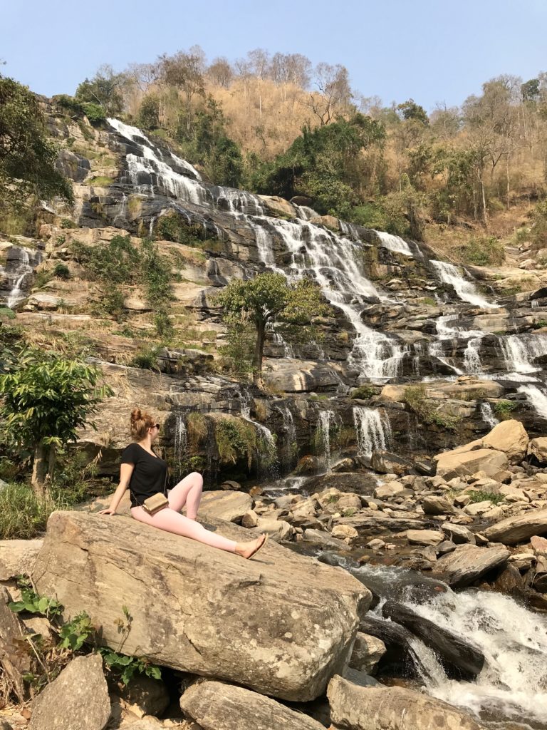 Zuerst haben wir einen Abstecher zu einem Wasserfall gemacht. Zu Stefans Freude waren dort 3 kleine Welpen, die mit Stefan gespielt haben. Danach fahren wir weiter zum richtigen Nationalpark und es geht 2500 m hoch auf den höchsten Berg Thailands. Leider ist es heute etwas diesig, sodass man keine so gute Aussicht vom Berg hat. Etwas unterhalb des Gipfels hat es zwei riesige Pagoden mit toll angelegten Gärten und Blick auf die Täler Danach fahren wir zum nächsten Parkplatz, von wo aus man auf einem Holzweg durch den Nebelwald laufen kann. Als Highlight gilt ein längerer Wanderweg den man nur mit Führer begehen darf. Dieser besteht vor allem aus vielen Stufen auf und ab und wir überholen unterwegs einige Rentner die mit dem Weg zu kämpfen haben. Nach der Hälfte erreichen wir einen Aussichtspunkt, welcher auf einem großen Getreidefeld liegt. Durch dieses muss man im Anschluss weiter entlang wandern, bevor es durch den Wald und über Treppen wieder zum Parkplatz geht. Dort sind wir dann doch froh, nach 1,5h ohne große Pause die Strecke hinter uns zu haben. Da wir zum nächsten Hotel ca. 3 Stunden fahren müssen brechen wir um 16 Uhr im Nationalpark auf. Wir kommen nochmals an Chiang Mai vorbei und planen noch etwas zu Abend zu essen. Durch Zufall gehen wir in ein amerikanisches Restaurant, welches von einem New Yorker geführt wird. Dort essen wir amerikanische Pizza und Burger mit Pommes. Danach fahren wir die letzte Strecke zum Hotel und werden von unserem wirklichen schönen Hotel empfangen. Komischerweise sind wir hier die einzigen Gäste. Stefan ist auch froh nach so viel aufregendem Autofahren angekommen zu sein. Die großen Straßen sind gut ausgebaut, jedoch fahren einige Autofahrer gefährlich. Sie überholen in Kurven ohne zu sehen ob jemand auf der Gegenfahrbahn kommt oder einige Beifahrer sitzen einfach auf dem Fahrzeugdach. Dazu gibt es viele Rollerfahrer auf die man ständig aufpassen muss. Auch werden die Straßen abenteuerlich, sobald man von der Hauptstraße abkommt. Da muss man dann aufpassen kein Huhn zu überfahren.